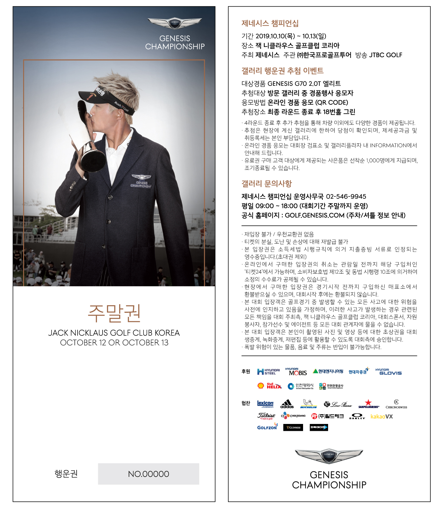 한국 남자 골프의 활성화를 도모하고자 2017년에 개최된 『제네시스 챔피언십』은 총 상금 15억원, 우승상금 3억 원을 비롯, 美 PGA 에 도전할 수 있는 기회를 제공하는 등 참가선수들에게 엄청난 혜택을 주는 대회입니다.