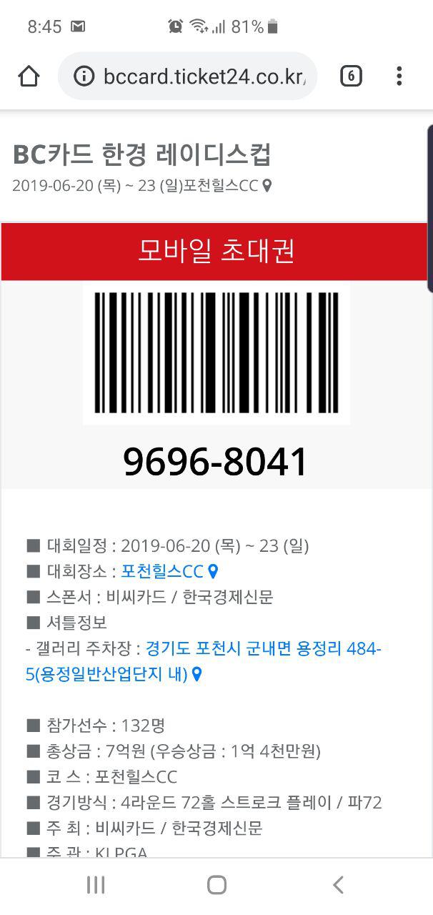 이번 6월에 경기도 포천힐스CC에서 열린 'BC카드 한경 레이디스컵 2019' 대회를 티켓24에서 진행했습니다.